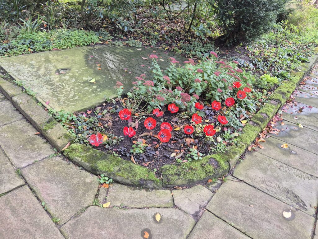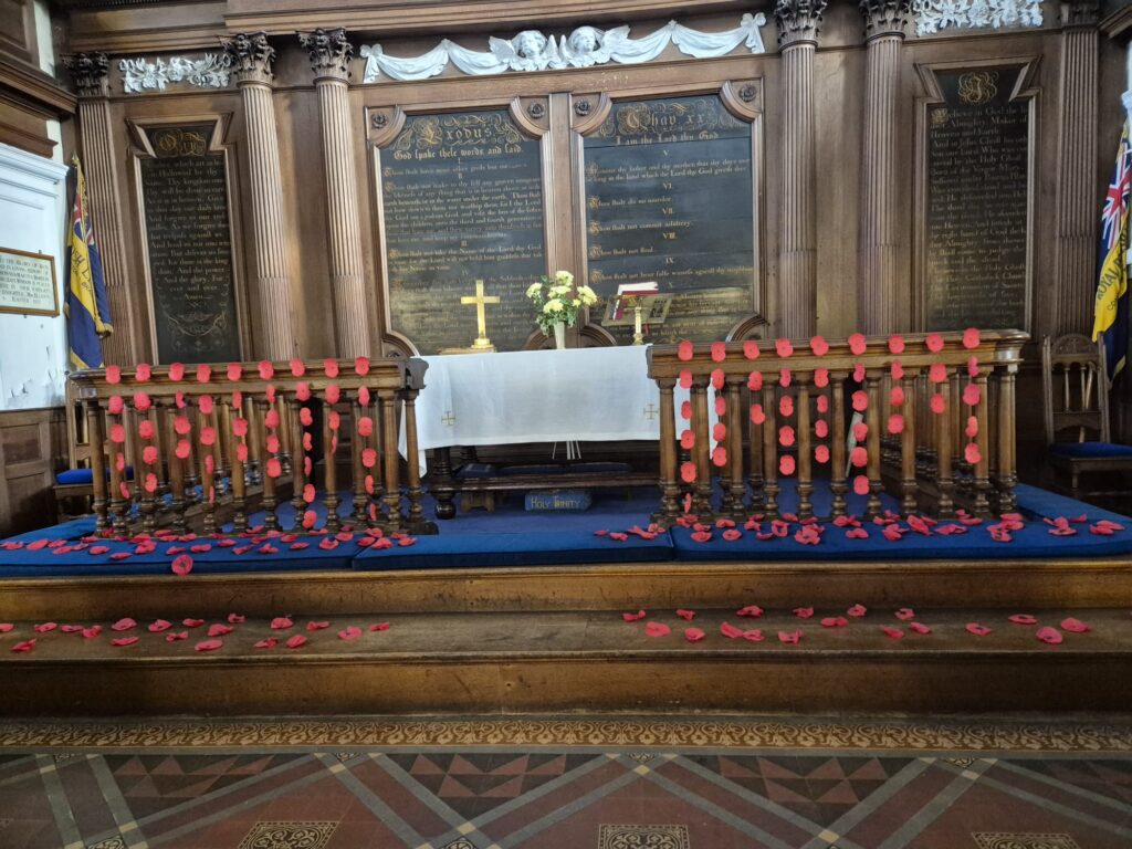 Several months ago we approached local schools and community organisations to help us create a special display in and around St. Peter’s Church for Remembrance. They cut up and painted bottles, crocheted, knitted and sowed producing hundreds of poppies in different forms which were then displayed in and around the church.